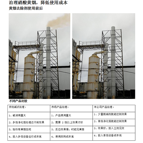 硝酸黃煙去除劑(脫硝劑)能和硝酸氣體(黃煙)即:氮氧化物進(jìn)行化學(xué)還原反應(yīng),生成氮?dú)?、水、水蒸汽等無(wú)害物質(zhì),消除NO2、NO(黃煙)的隱患。